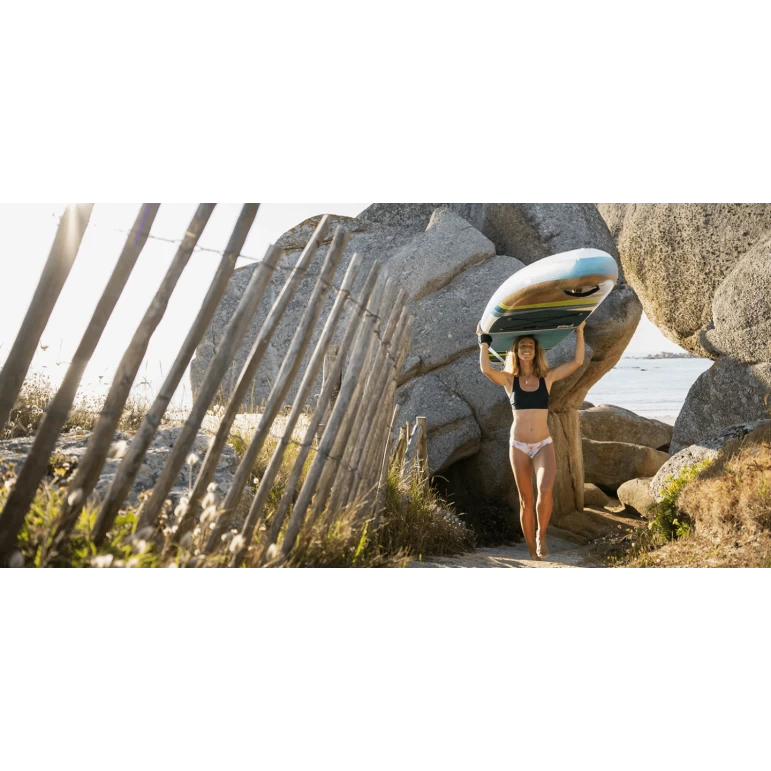 L’équipement est complet avec des tendeurs élastiques pour accrocher du matériel sur l’avant, 3 poignées de portage, un anneau inox d’accrochage, un pad de qualité, un aileron central démontable sur un bloc US.